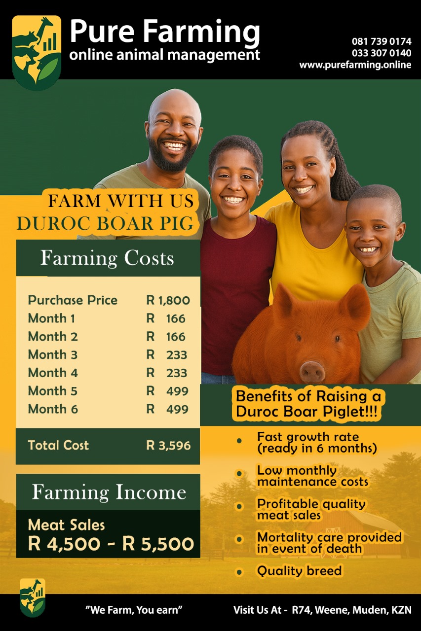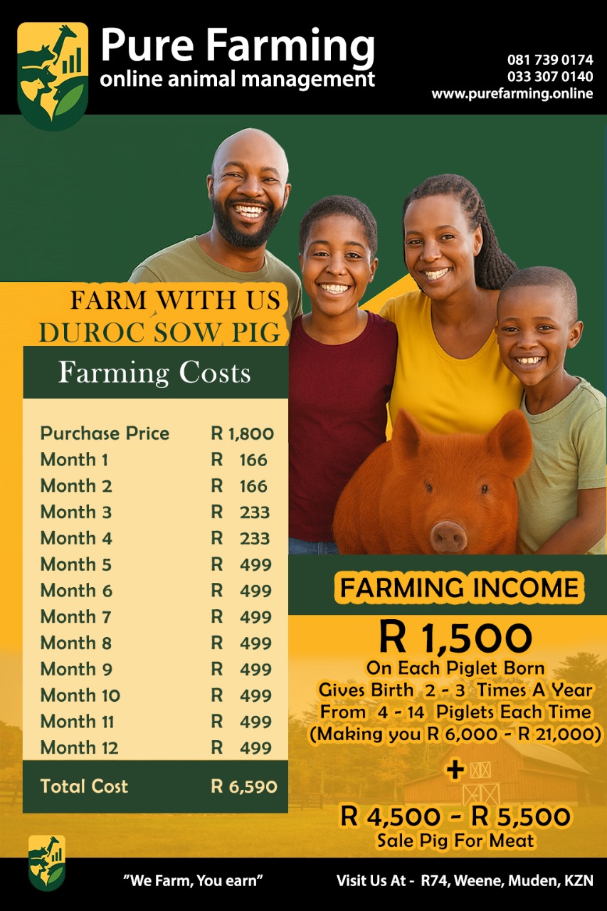 At Pure Farming, we make it simple for anyone to own and profit from pig farming — without needing a farm of their own. For just R1,800, you can purchase a healthy sow or boar, and our expert team will take care of everything else.